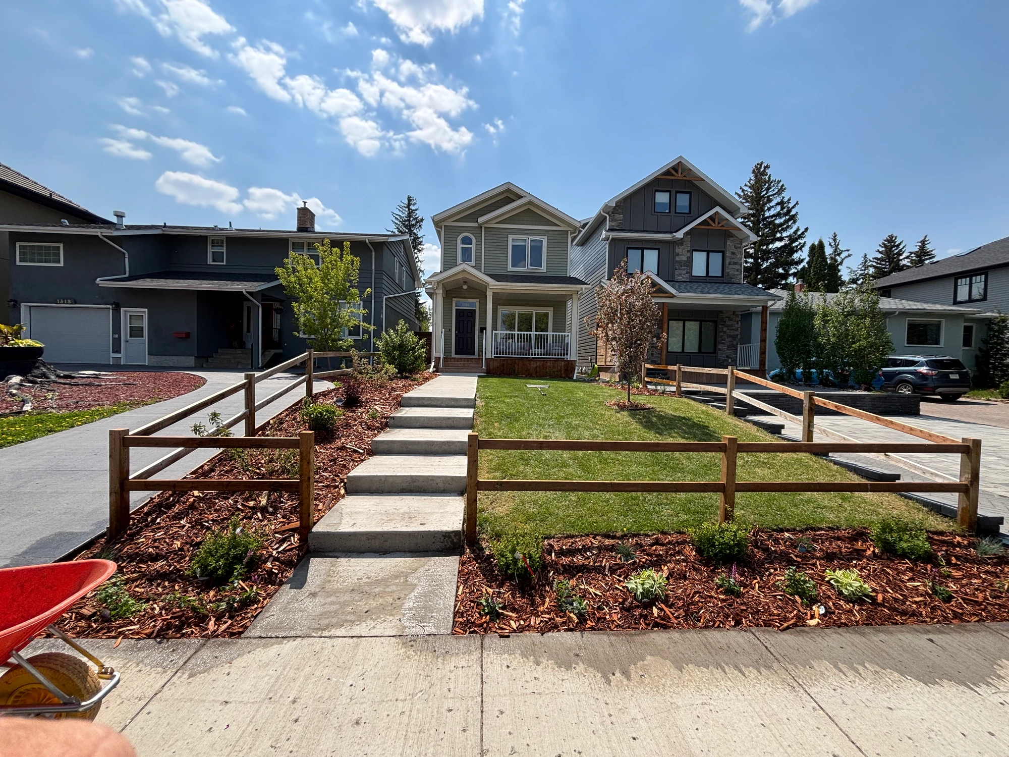A wide-angle, bright outdoor shot shows a modern light-green two-story house with a manicured front yard. A series of clean concrete steps leads from the public sidewalk up to the front porch. The yard is divided by a rustic, two-rail wooden split-rail fence. To the left of the steps, a garden bed is filled with dark brown mulch and young shrubs. The right side features a vibrant green lawn and a small ornamental tree. In the background, neighboring grey and blue houses stand under a bright, partly cloudy blue sky. A red wheelbarrow is partially visible in the bottom-left corner, suggesting recent landscaping work.