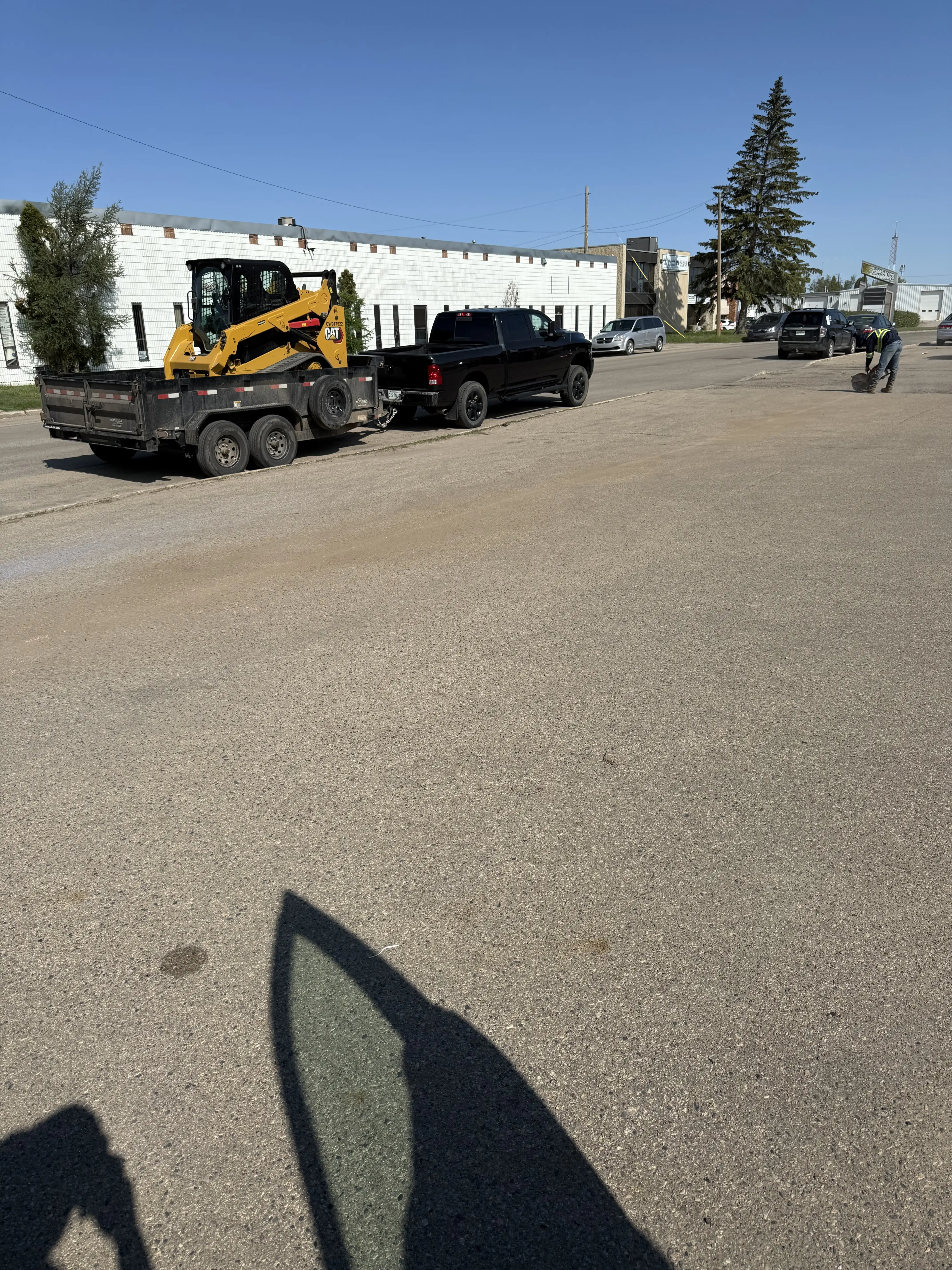 A high-angle, outdoor shot on a clear, sunny day shows a black pickup truck parked on the side of a wide, paved road. The truck is hitched to a black dual-axle flatbed trailer carrying a bright yellow Caterpillar (CAT) skid steer. In the background, there is a long white industrial building with dark windows and a few parked cars further down the street. The foreground shows a large expanse of asphalt with a long shadow cast from the person taking the photo.
