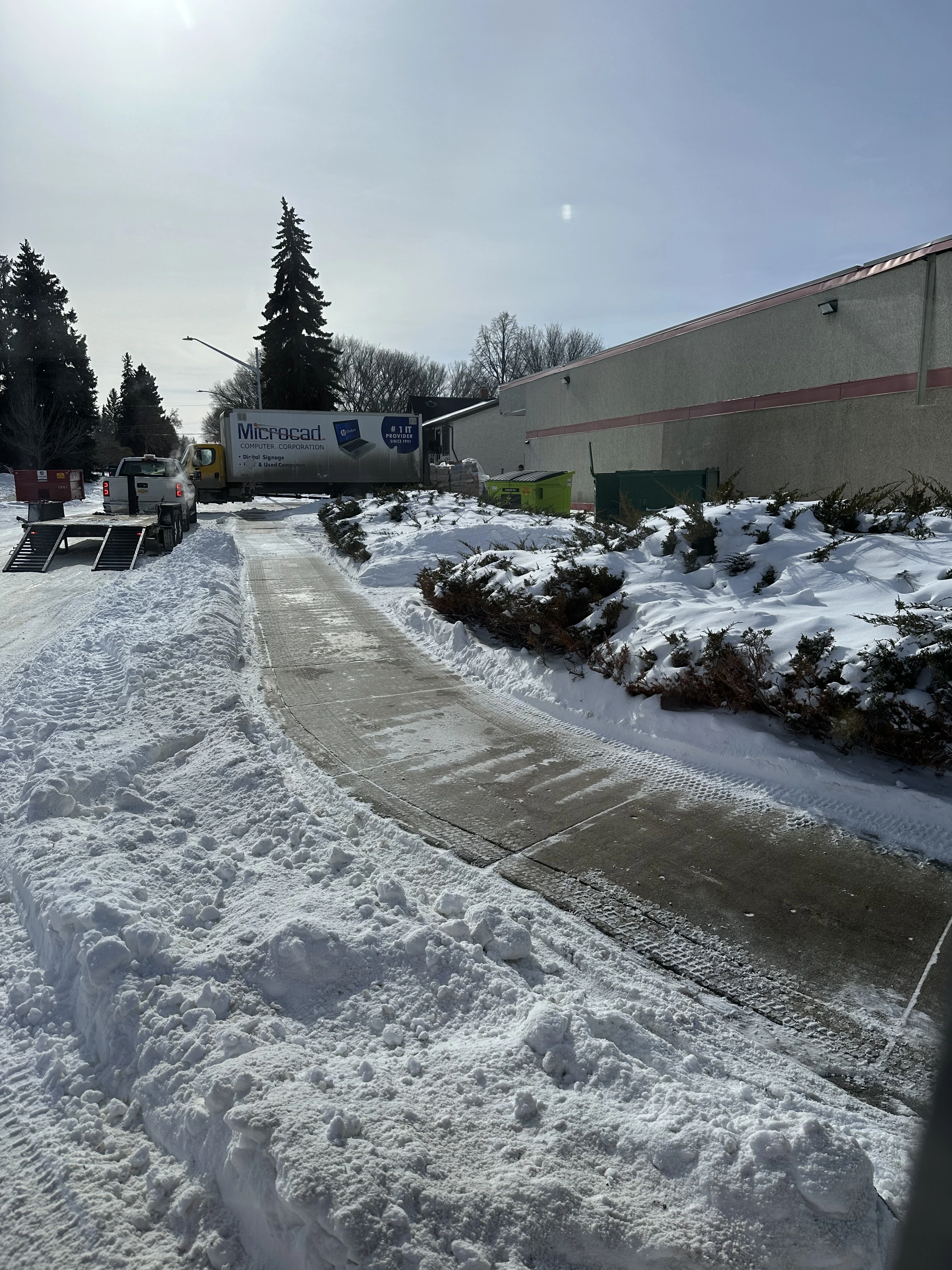 A bright, high-angle outdoor shot shows a commercial property during winter. A clean, wet concrete sidewalk has been cleared of heavy snow, cutting a path through deep, plowed snowbanks on either side. To the right, low green shrubs are partially buried under white snow next to a long, beige industrial building with a red stripe. In the background, a white Microcad delivery truck is parked near a loading area, and tall evergreen trees stand against a clear, sunny sky. Large tire tracks from a plow or heavy equipment are visible in the snowbanks in the foreground.