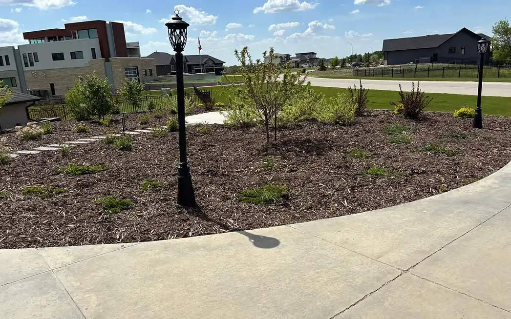 - Professional landscaping in Saskatoon showing a newly mulched garden bed with decorative lamp posts and young trees