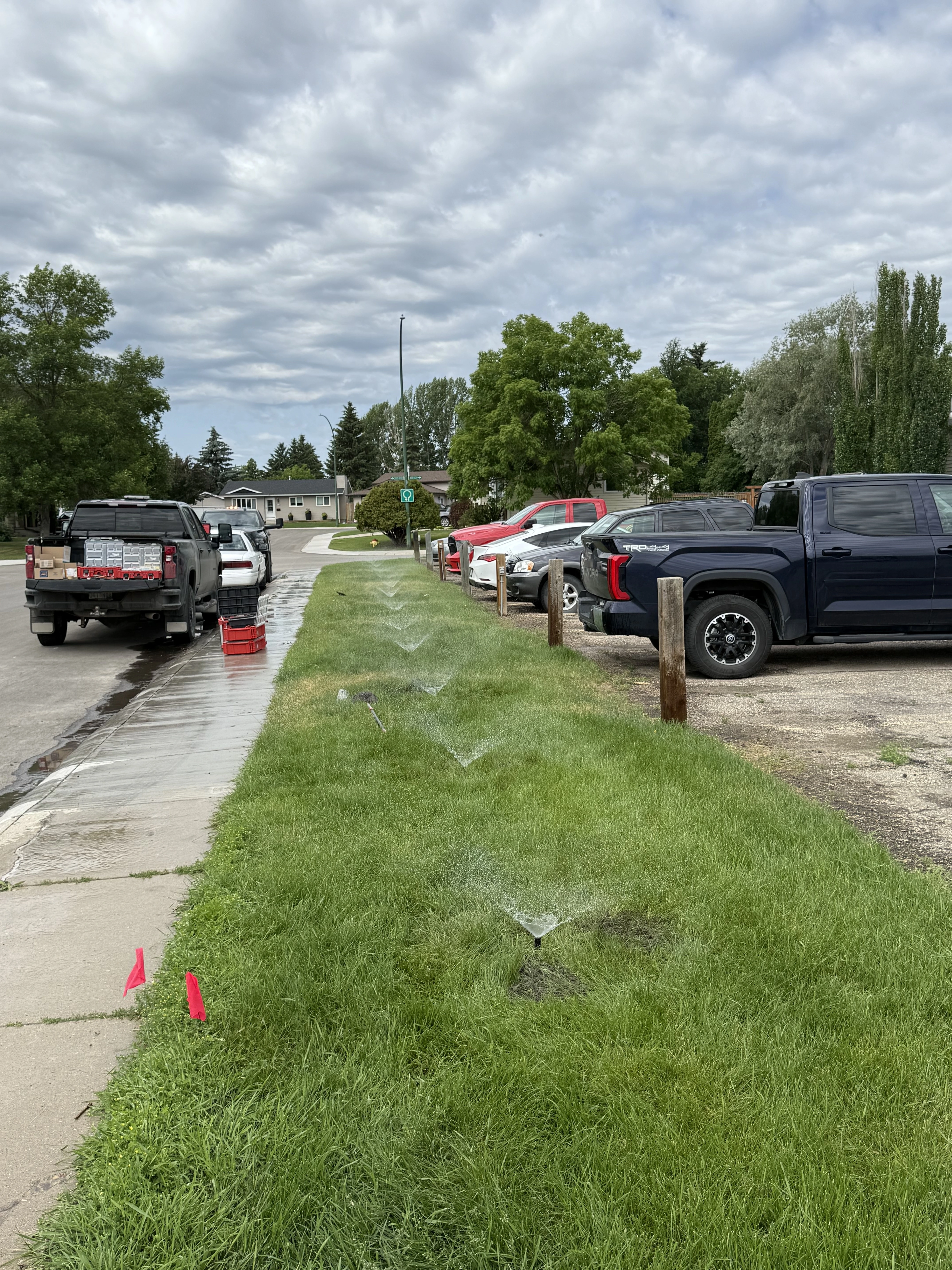 A vertical outdoor shot shows a line of six active sprinklers watering a long, narrow strip of green grass. The grass is situated between a wet concrete sidewalk on the left and a gravel parking area on the right. To the left, a dark pickup truck is parked on the street with red crates and equipment in the bed. To the right, several cars and a dark blue truck are parked behind short wooden posts. Two small red utility flags are stuck in the grass in the foreground. The sky is overcast with textured grey clouds, and suburban houses and leafy green trees are visible in the background.