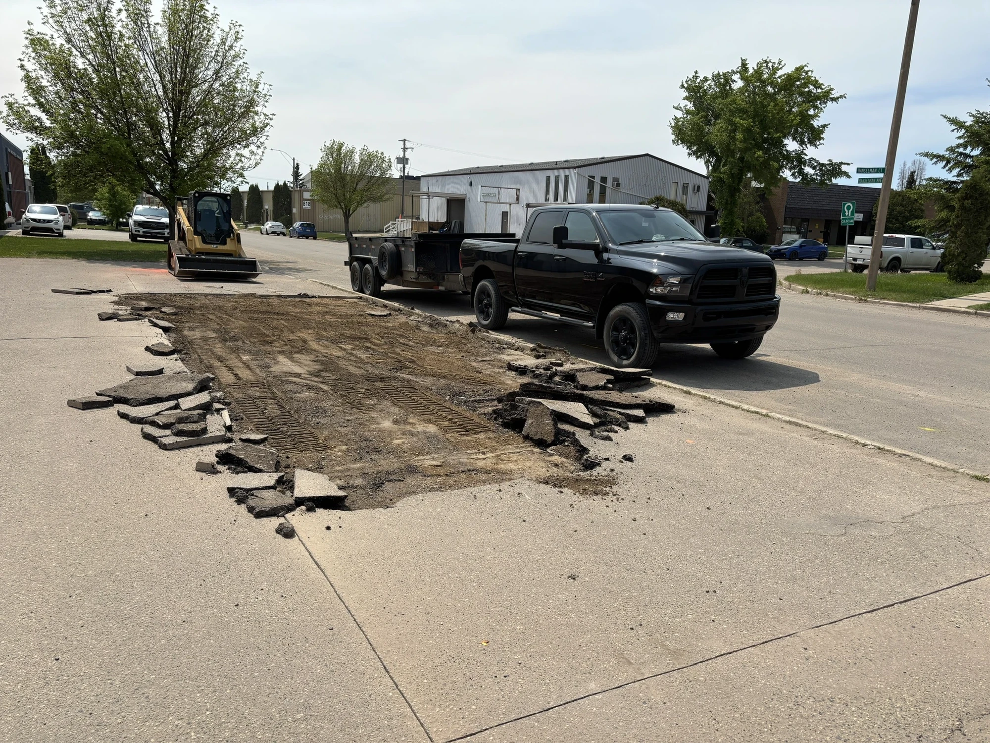 A high-angle outdoor shot shows a construction site on a paved street. In the foreground, a large, rectangular section of the asphalt has been broken up and excavated, revealing dirt and tire tracks underneath. Scattered chunks of broken pavement lie around the edges of the hole. To the right, a black Ram pickup truck with a large flatbed trailer is parked at the curb. In the background, a yellow skid steer loader is positioned further down the street near some green trees and a white industrial building under a bright, overcast sky.