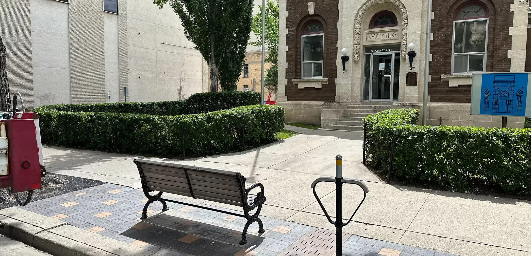 - Exterior of the Old Land Titles Building in Saskatoon, featuring a courtyard with hedges and a park bench.