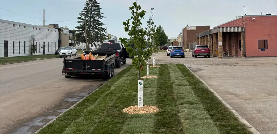 - A newly landscaped green lawn strip with three young trees planted in an industrial parking area.